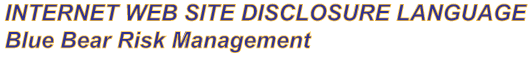 General Disclaimer Solicitation of Insurance/Risk Management Services The information and descriptions contained in this site are intended as general information and are not necessarily complete descriptions of all terms, exclusions and conditions applicable to the products and services offered by Blue Bear Risk Management. Blue Bear Risk Management is licensed in the State of New York. It may be licensed in other jurisdictions as well, and should you desire to determine such information, please contact Blue Bear Risk Management. Warning about E-Mail Information that is transmitted by e-mail over the Internet is not secure and can be intercepted by other Internet users. Please do not use e-mail to send Blue Bear Risk Management any private or confidential data about yourself or others. Additionally, Blue Bear Risk Management will endeavor to not use e-mail to transmit any responses that contain private or confidential data on an individual. Copyright Notice The names, trademarks, service marks and logos of Blue Bear Risk Management may not be used in any advertising or publicity, or otherwise to indicate Blue Bear Risk Management’s sponsorship of or affiliation with any product or service, without Blue Bear Risk Management’s prior express written permission. No Warranty Blue Bear Risk Management does not warrant the accuracy, adequacy or completeness of the information and materials contained in this site and expressly disclaims liability for any errors or omissions in the information and materials. No warranty of any kind, implied, express or statutory, including but not limited to the warranties of non-infringement of third-party rights, title, merchantability, fitness for a particular purpose and freedom from computer virus, is given in conjunction with the information and materials contained in this site. Limited Liability In no event will Blue Bear Risk Management, its agents or employees, be liable in any damages, losses or other expenses arising in connection with this site or use thereof or inability to use by any party, or in connection with any failure of performance, error, omission, interruption, defect, delay in operation or transmission, computer virus or line or system failure, even if Blue Bear Risk Management, or its representatives are advised of the possibility of such damages, losses or other expenses. |